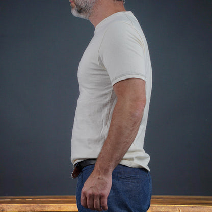The cotton is lighter to medium weight, incredibly soft. The construction and sewing is sturdy, intricate and sewn to last. The details are vintage and painstaking to produce and the fit is slightly classic tee being well proportioned and very comfortable to wear.