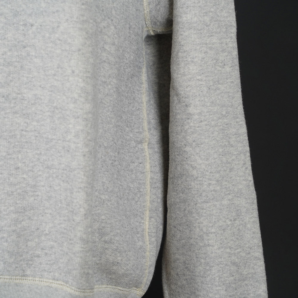 The 100% Cotton material is an original old sinker style super fluffy fleece knit. It is thick with a super fluffy brushed inner and a vintage raised finish to the outer, has a ribbed neck, cuffs and hem and has 4-needle flatseam construction (Union special 36200) to the body/ neck and 3-needle seamed cuffs and hem.