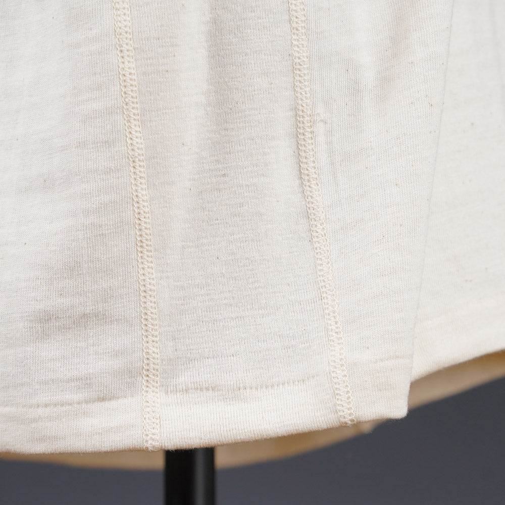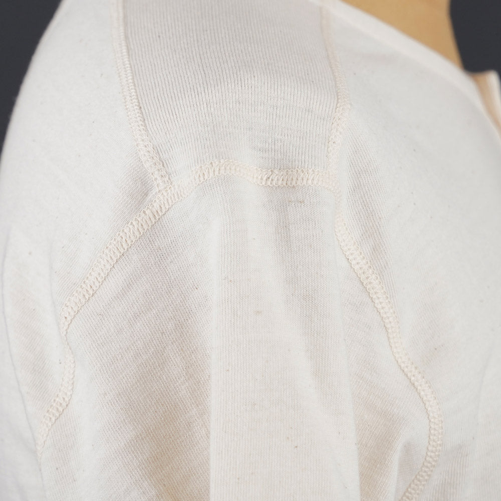 The cotton is a natural Oatmeal mid weight (heavier for a t-shirt) breathable slub fabric, very soft to touch but has on old-worldy texture. It is produced on vintage loop-wheeled machines at a sluggish pace which produces the slightly slubby/ textured feel and the soft handle that, regardless of multiple washes, will stay soft even though it is an incredibly sturdy fabric.