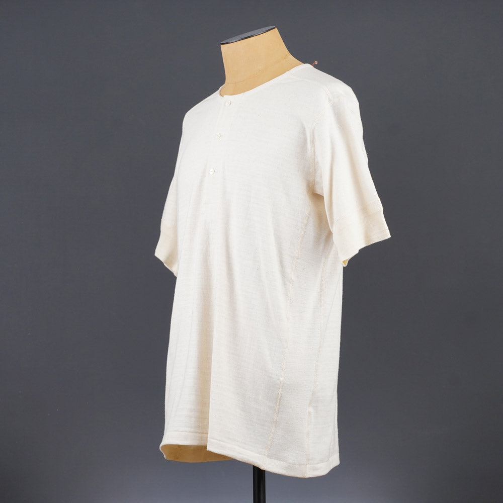 The fit is great, it fits and feels like a t-shirt they made for underwear back in “the good ole days” with intricate styling and fit details such as the updated panelled side seam and vintage tubular sleeve ribs, a change in direction of the shoulder fabric (for mobility) and internal cotton faced button neck opening.