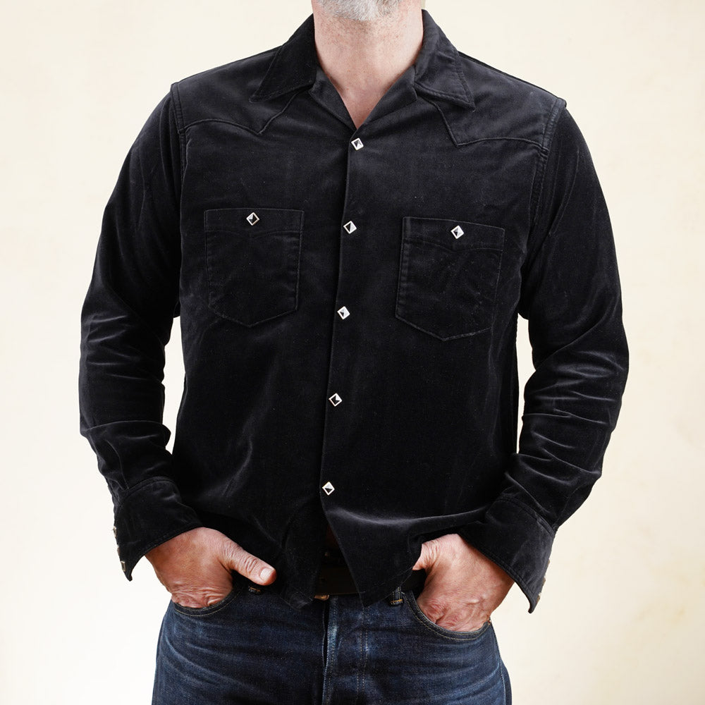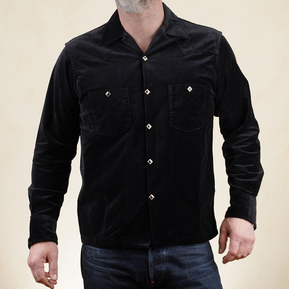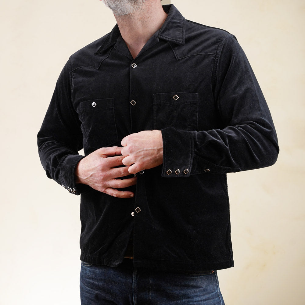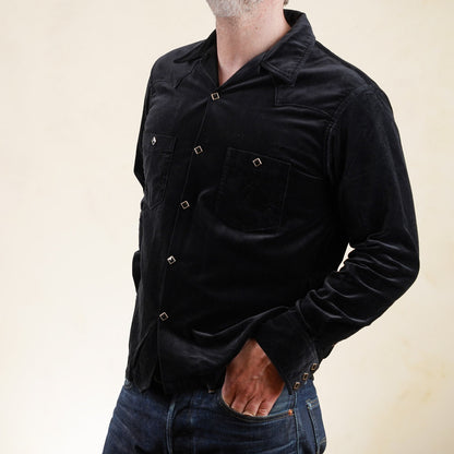 The velveteen cotton fabric is mid weight and has a lovely drape and gives this style an air of class. Combine the fabric with piped outer yoke seams and diamond snaps and you've got a very original styled shirt that can be worn as a lightweight jacket as well.