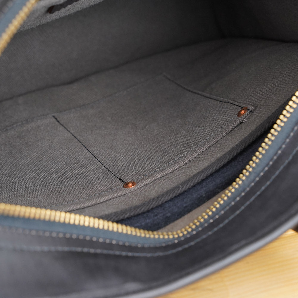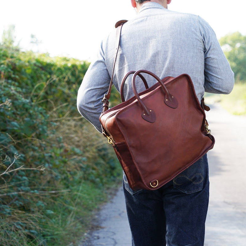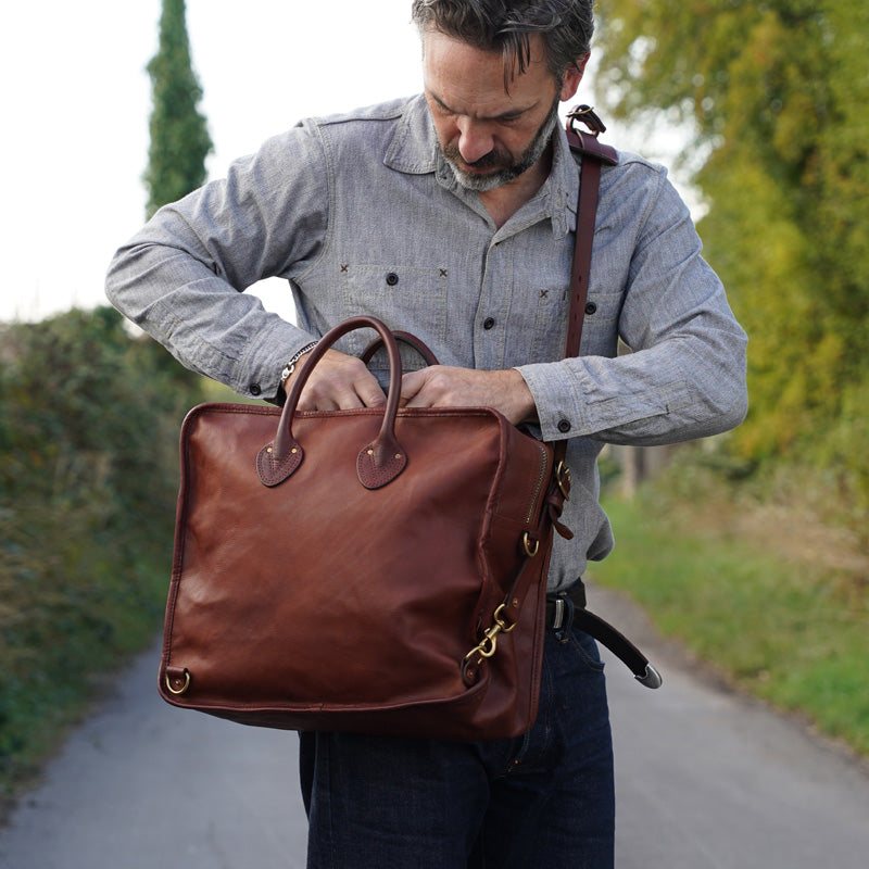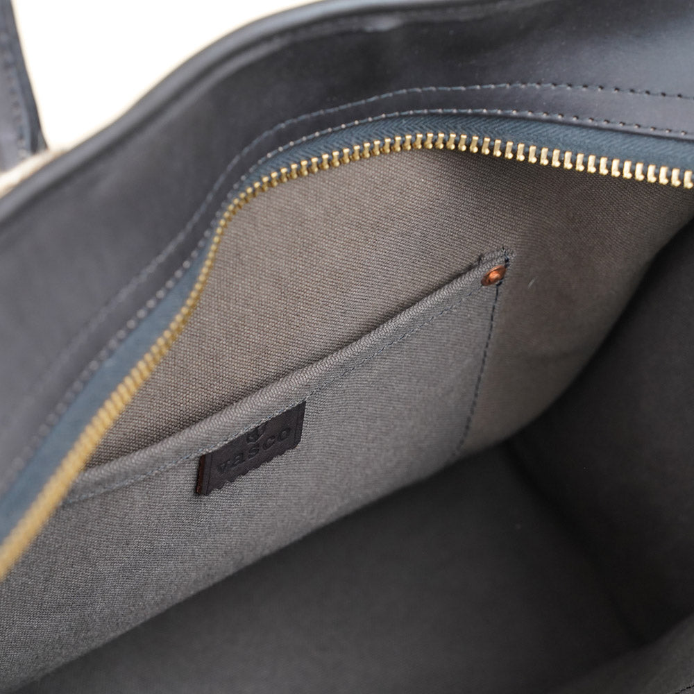 The brass fittings are custom made for Vasco, the interior is lined with a heavy duty canvas and the removable thick leather strap is comfortable and can be either removed or buckled to the handles when carrying as a tote. Nice details and nothing has been missed.