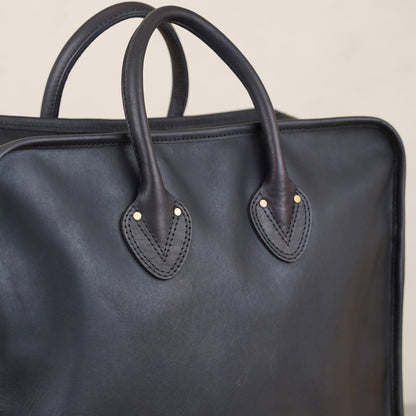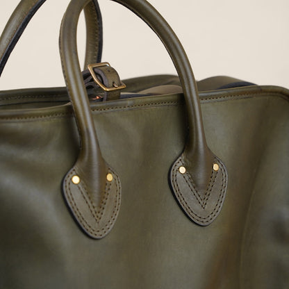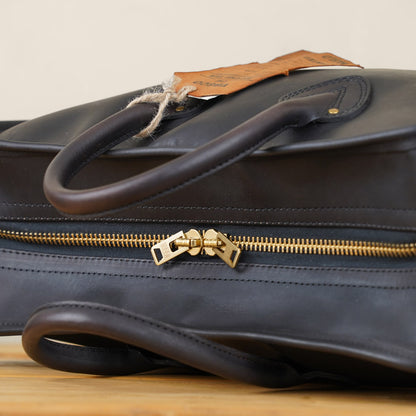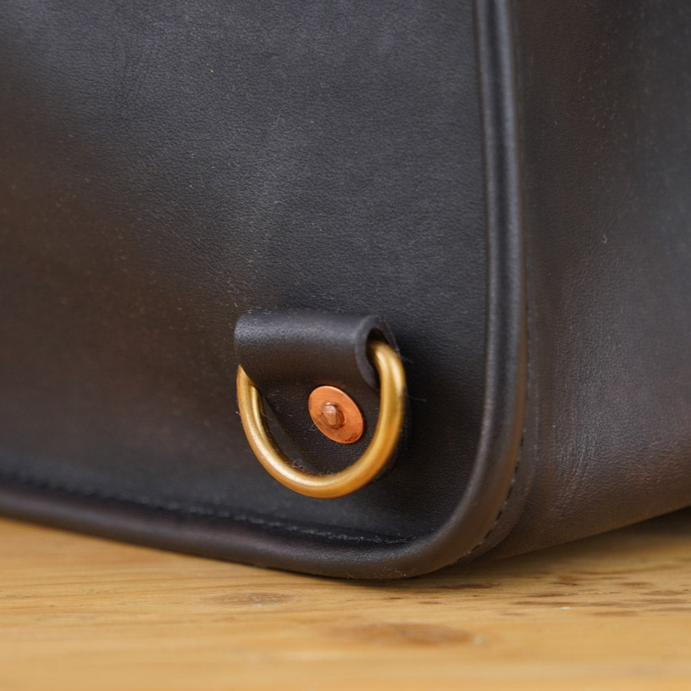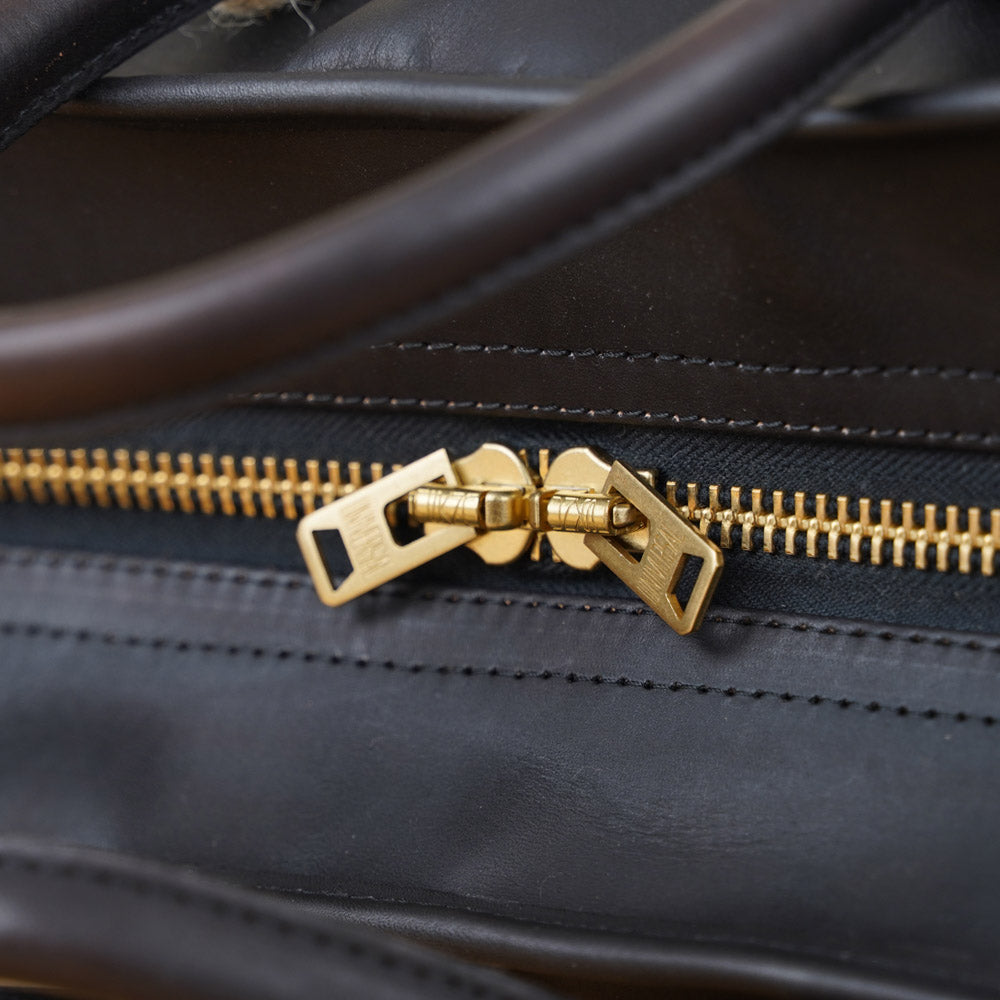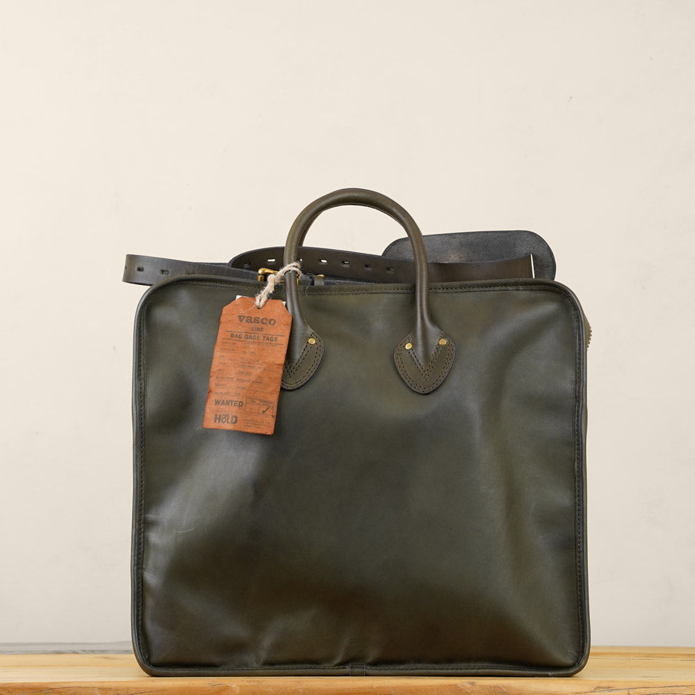 The brass fittings are custom made for Vasco, the interior is lined with a heavy duty canvas and the removable thick leather strap is comfortable and can be either removed or buckled to the handles when carrying as a tote. Nice details and nothing has been missed.