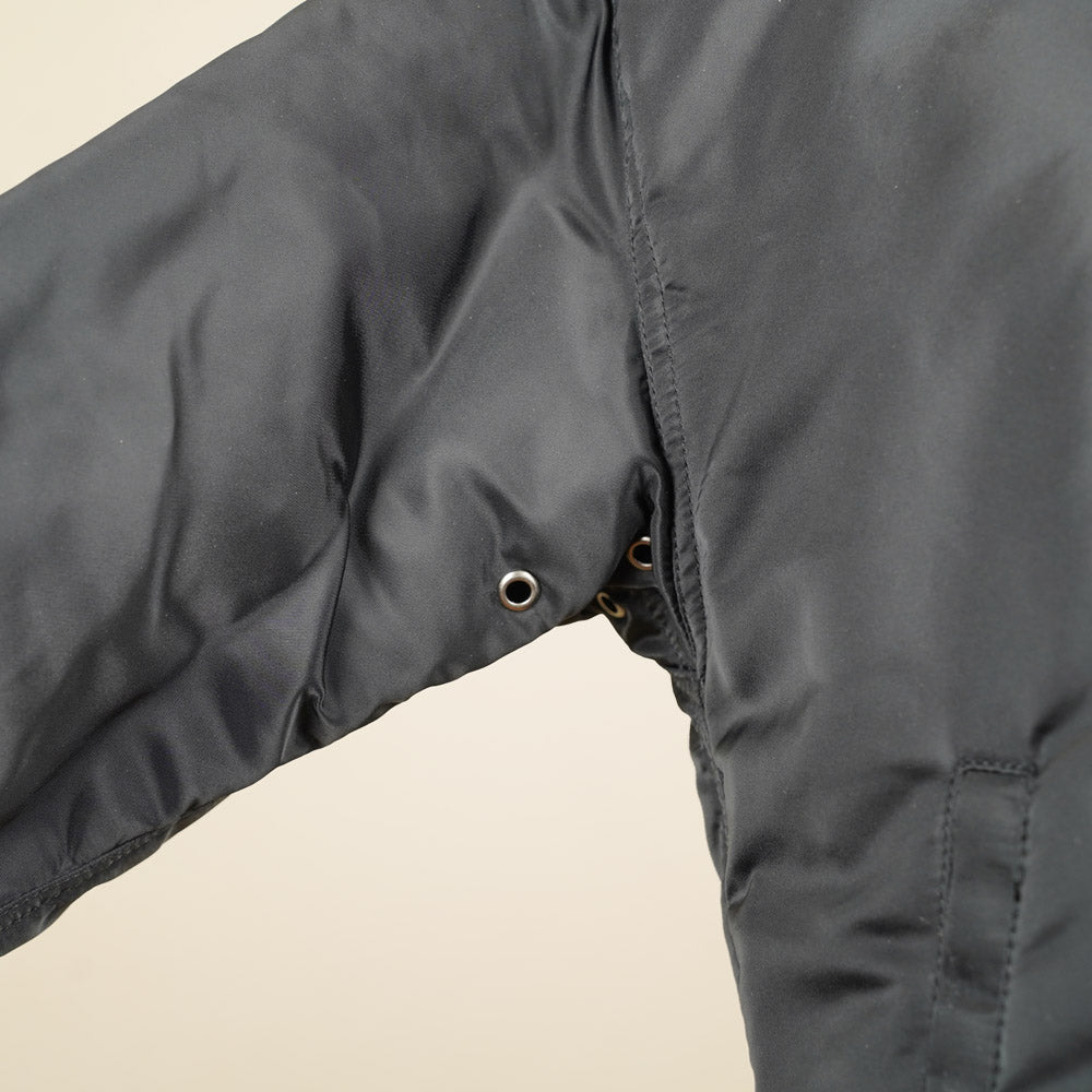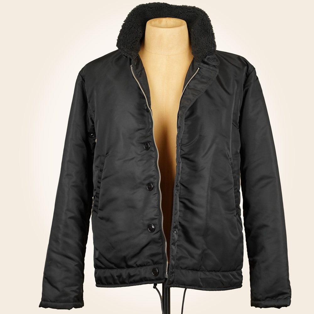 Cut and sewn in Japan from a solid black water-repellent high-density nylon twill, it's a weather tough but soft outer. It has a hard sheep boa collar and the lining is a lightweight yet highly insulating 3M Thinsulate, EX-soft.