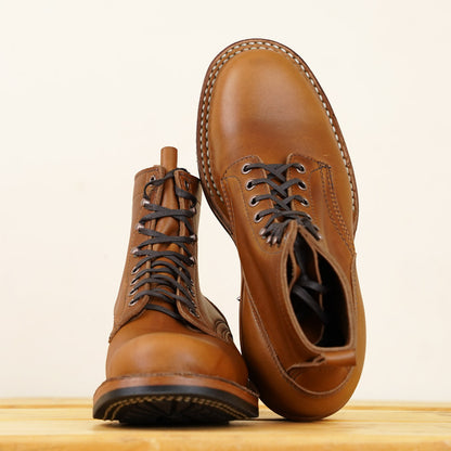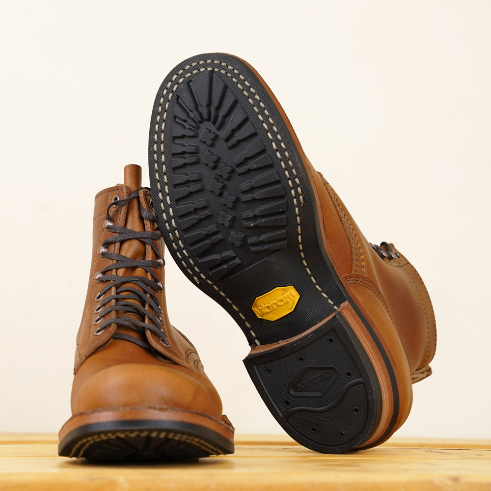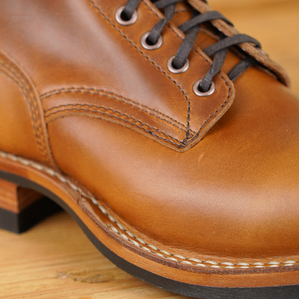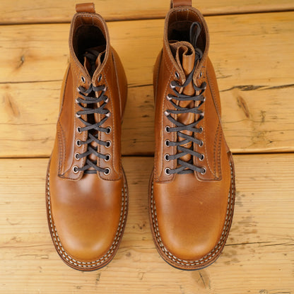 The Natural Double Shot leather is a patina dream. It’s nice stuff. Slightly glossy and plush like CXL to begin with (it can stay this way with care if you like), thick but pliable and is complimented beautifully with the natural sole edge dressing and stitching. A Great, classic pair of boots that will look better the more you wear them.
